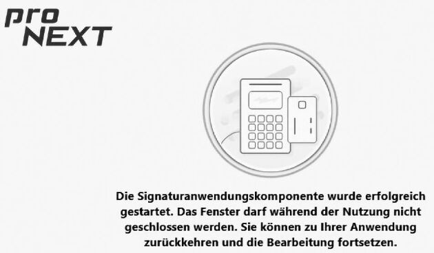 Dieses Fenster wird als „Pop-Up“-Fenster geöffnet und muss während der Nutzung geöffnet bleiben (es kann im Hintergrund ausgeführt werden). Es erscheint die proNEXT Signaturanwendungskomponente: