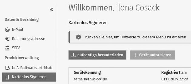 Um in der beA-App kartenlos zu signieren, benötigen Sie die App „authentigo“.Diese kann im Kundenportal heruntergeladen werden: