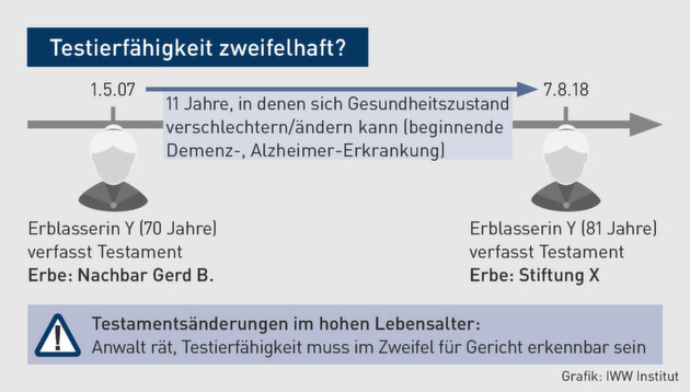 Die Süddeutsche Zeitung berichtete kürzlich von einer über 80-Jährigen, die in ihrem Testament einen Nachbarn benannte und wenige Monate darauf einen Notar aufsuchte, um eine Kinderstiftung als Erben einzusetzen. Das erste Testament war da schon fast vergessen. Der Artikel setzt sich auch mit einem damit möglicherweise verknüpften Problem auseinander: Gerichte müssen die Testierfähigkeit beurteilen und eine beginnende Demenzerkrankung steht im Raum.
