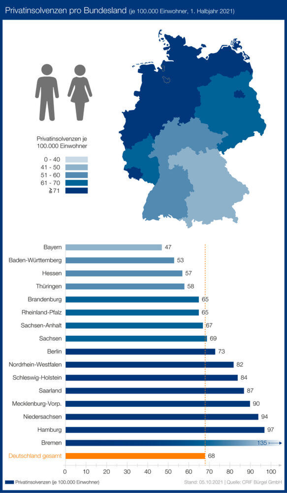 Bundesweit gab es im 1. Halbjahr 2021 68 Privatinsolvenzen je 100.000 Einwohner. Die nördlichen Bundesländer sind dabei auch in den ersten sechs Monaten stärker von Privatinsolvenzen betroffen als der Süden Deutschlands. So führt Bremen die Statistik mit 135 Privatinsolvenzen je 100.000 Einwohnern an. Es folgen Hamburg mit 97 und Niedersachsen mit 94 Insolvenzfällen je 100.000 Einwohner. Am wenigsten Privatinsolvenzen verzeichneten im 1. Halbjahr 2021 Bayern (47 Fälle je 100.000 Einwohner), Baden-Württemberg (53) und Hessen (57).