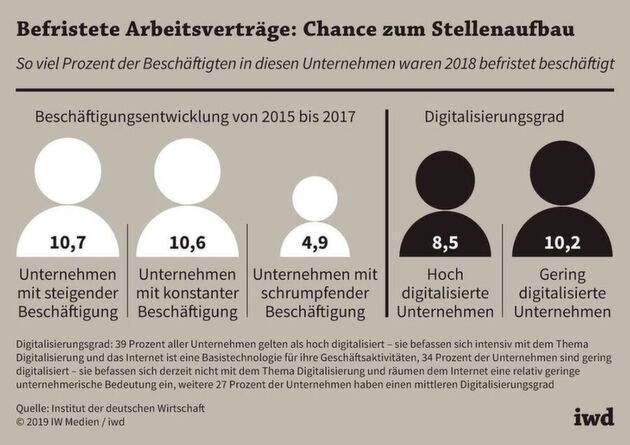 Das IW Institut der deutschen Wirtschaft spricht von „einem Spiel mit dem Feuer“. Gut drei Viertel der Unternehmen mit mehr als 250 Mitarbeitern hätten dann zu viele befristet Beschäftigte. Zum anderen zeigt eine IW-Untersuchung aus 2019, dass Befristungen vor allem von Firmen genutzt werden, die Beschäftigung aufbauen.