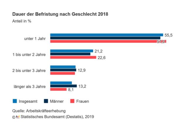 Von den 2,7 Millionen befristet Beschäftigten hatten 21,2 Prozent die Befristung ein bis unter zwei Jahre, bei weiteren 12,6 Prozent zwei bis unter drei Jahre. 10,7 Prozent gaben an, einen Vertrag mit einer Laufzeit von mehr als drei Jahren zu besitzen.