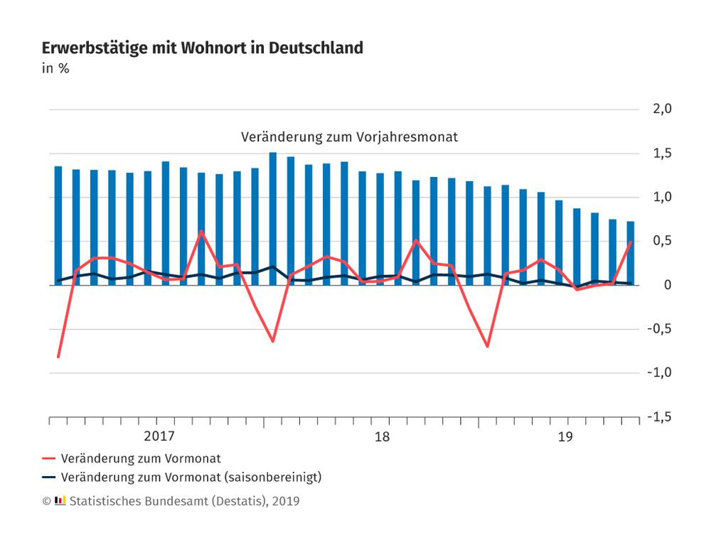 Im September 2019 waren nach Berechnungen des Statistischen Bundesamtes (Destatis) 45,3 Millionen Personen erwerbstätig. Gegenüber September 2018 nahm die Zahl der Erwerbstätigen um 0,7 Prozent zu (+327.000 Personen).