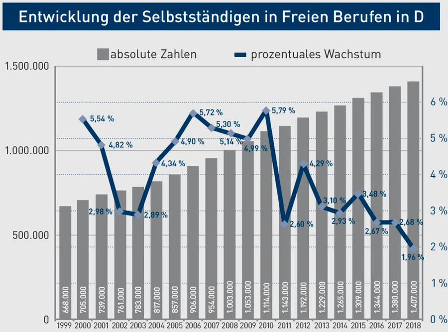 Am 1.1.18 gab es 1,4 Mio. Freiberufler in Deutschland (Vorjahr: 1,38 Mio.). Dies entspricht einem Zuwachs von +1,8 %. Zwischen 2000 und 2010 lagen die jährlichen Zuwachsraten noch bei etwa 5 %. Seither ist die ...