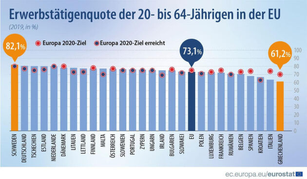 | Im Jahr 2019, bevor die Mitgliedstaaten von der Corona-Pandemie erfasst wurden, lag die Erwerbstätigenquote der Bevölkerung im Alter von 20 bis 64 Jahren in der Europäischen Union (EU) mit 73,1 Prozent höher als im Jahr 2018 (72,4 Prozent). Das strategische Ziel lag bei mindestens 75 Prozent. Immerhin: 17 Mitgliedsstaaten haben das bis 2020 erreicht. |