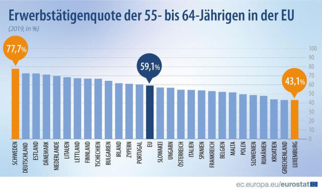 Im Jahr 2019 war in 21 EU-Mitgliedstaaten mehr als die Hälfte der Bevölkerung im Alter von 55 bis 64 Jahren erwerbstätig. Die höchste Erwerbstätigenquote für diese Altersgruppe wurde in Schweden (77,7 Prozent) verzeichnet, gefolgt von Deutschland (72,7 Prozent), Estland (72,5 Prozent) und Dänemark (71,3 Prozent). Die niedrigsten Erwerbstätigenquoten wurden in Luxemburg (43,1 Prozent), Griechenland (43,2 Prozent) und Kroatien (43,9 Prozent) registriert. Im Vergleich zu 2018 stieg die Erwerbstätigenquote der 55- bis 64-Jährigen im Jahr 2019 in allen EU-Mitgliedstaaten mit Ausnahme von Schweden an.