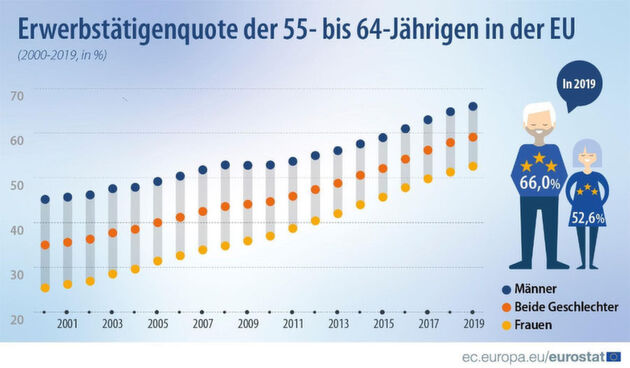 Der Aufwärtstrend bei der Erwerbstätigenquote lässt sich in den Jahren bis 2019 sowohl für Männer als auch für Frauen erkennen. Bei den Männern hat sich die Erwerbstätigenquote seit 2013 stetig erhöht und erreichte im Jahr 2019 79,0 Prozent. Die Erwerbstätigenquote der Frauen ist seit 2010 kontinuierlich gestiegen und erreichte im Jahr 2019 67,3 Prozent. Auch die Erwerbstätigenquote der 55- bis 64-Jährigen ist in der EU in den letzten Jahren stetig angestiegen, von 35,0 Prozent im Jahr 2000 auf 59,1 Prozent im Jahr 2019. Die stärkere Erwerbsbeteiligung älterer Arbeitnehmer ist ebenfalls eines der Ziele, das mit der Strategie Europa 2020 im Bereich Beschäftigung angestrebt wird.