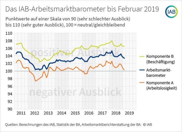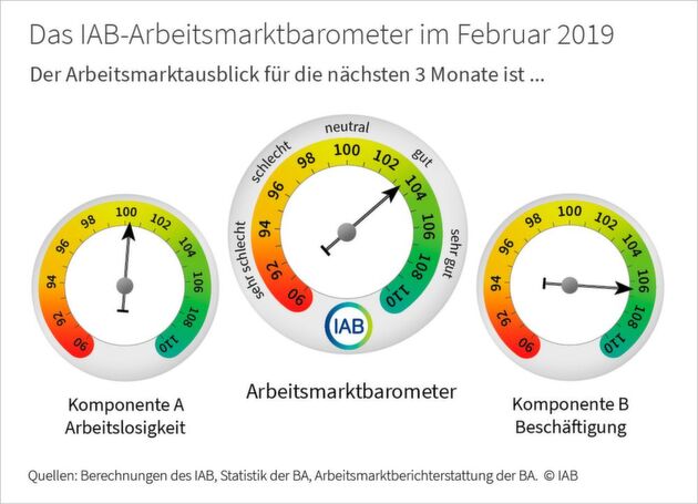 Das IAB-Arbeitsmarktbarometer ist ein Frühindikator, der auf einer monatlichen Umfrage der Bundesagentur für Arbeit unter allen lokalen Arbeitsagenturen basiert. Während Komponente A des Barometers die Entwicklung der saisonbereinigten Arbeitslosenzahlen für die nächsten drei Monate prognostiziert, dient Komponente B der Vorhersage der Beschäftigungsentwicklung. Der Mittelwert aus den Komponenten „Arbeitslosigkeit“ und „Beschäftigung“ bildet den Gesamtwert des IAB-Arbeitsmarktbarometers. Dieser Indikator gibt damit einen Ausblick auf die Gesamtentwicklung des Arbeitsmarkts. Da das Saisonbereinigungsverfahren laufend aus den Entwicklungen der Vergangenheit lernt, kann es zu nachträglichen Revisionen kommen. Die Skala des IAB-Arbeitsmarktbarometers reicht von 90 (sehr schlechte Entwicklung) bis 110 (sehr gute Entwicklung).