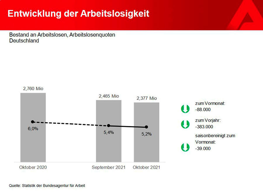 „Arbeitslosigkeit und Unterbeschäftigung sinken kräftig, Beschäftigung und die Nachfrage der Unternehmen nach neuem Personal nehmen zu und Kurzarbeit ist weiter rückläufig. Die Folgen der Corona-Krise auf dem ...