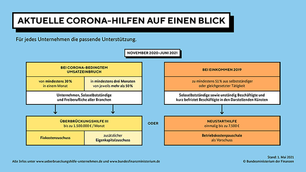 Im Mai ist die Überbrückungshilfe III nochmals angepasst worden. Dazu zählen die Neustarthilfe für Soloselbstständige, überarbeitete Regelungen für besonders getroffene Branchen und weitere Härtefall-Hilfen für ...