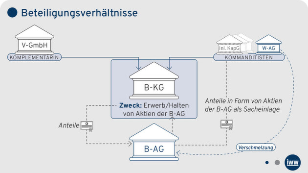 Die W-AG war Kommanditistin der B-KG. Die W-AG wurde auf die B-AG verschmolzen. Die B-AG kündigte daraufhin ihre verschmelzungsbedingt erworbene Kommanditbeteiligung an der B-KG und schied mit Wirkung gegen eine Abfindung in Form von (eigenen) Stückaktien sowie einer zusätzlichen Barleistung aus der B-KG aus. Die auf die B-AG zurückübertragenen Aktien zog diese im vereinfachten Einziehungsverfahren gem. § 237 Abs. 3 Nr. 3 des Aktiengesetzes (AktG) ohne Kapitalherabsetzung ein. Hierdurch verringerte sich die Gesamtanzahl der Aktien der B-AG und es erhöhte sich der rechnerische Anteil je verbleibender Aktie entsprechend.