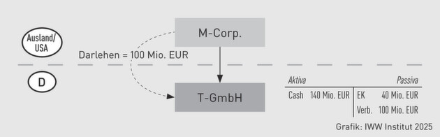 Die in den USA ansässige Muttergesellschaft (M-Corp.) hat in 2021 ein Darlehen i. H. v. 100 Mio. EUR mit einer zehnjährigen Laufzeit an eine deutsche Tochtergesellschaft zu einem fremdvergleichskonformen Zinssatz von 3 % vergeben, welches in EUR valutiert. Im Zeitpunkt der Ausreichung war das Darlehen annahmegemäß voll werthaltig. Die T-GmbH erwirtschaftet darüber hinaus seit Jahren konstante Gewinne, sodass Ende 2024 ein positives Eigenkapital bestand. Im Dezember 2024 führte die M-Corp. im Rahmen einer Rekapitalisierungsmaßnahme einen vollumfänglichen expliziten, d. h. offenen Forderungsverzicht durch. Aufgrund der Zinspolitik der FED und EZB ist es allerdings zu einem Anstieg des allgemeinen Zinsniveaus gekommen, sodass für ein vergleichbares Darlehen mit einer Restlaufzeit von sieben Jahren im Zeitpunkt des Forderungsverzichts ein Zinssatz von 6 % unter Fremdvergleichsgesichtspunkten einschlägig gewesen wäre. |