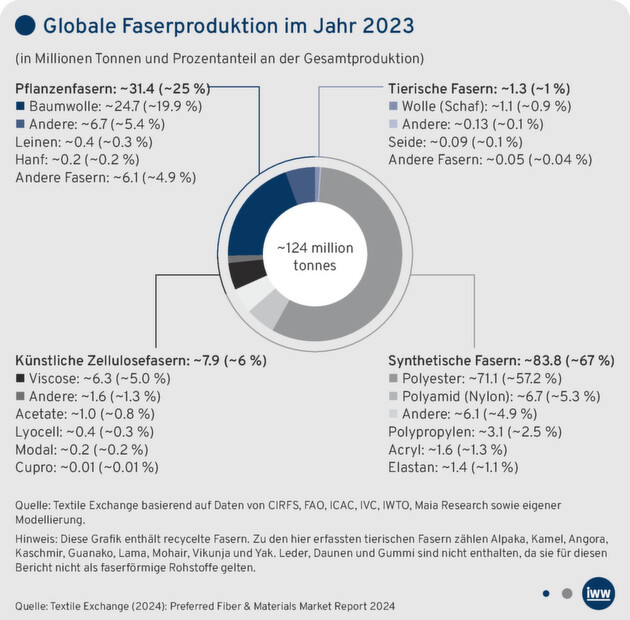 Trotz bekannter Umweltauswirkungen wächst die Branche weiter. Im Jahr 2023 wurden weltweit rund 124 Mio. Tonnen textile Fasern hergestellt – doppelt so viel wie zu Beginn des Jahrtausends. Diese Menge umfasst sämtliche Fasern, die für Bekleidung, Heimtextilien, Schuhe und technische Anwendungen eingesetzt werden.