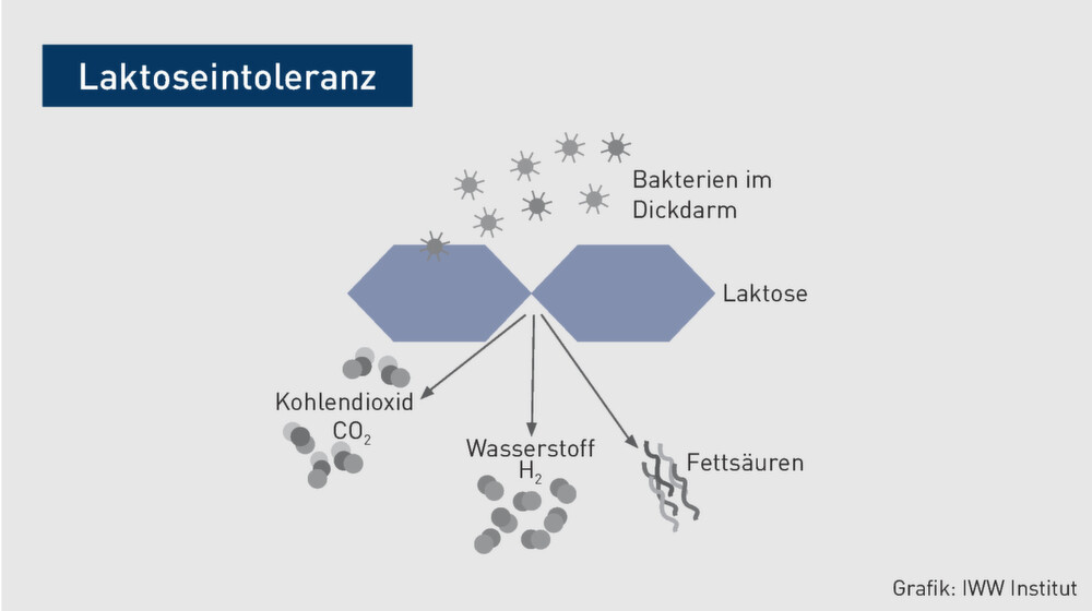 Aufgabe des Enzyms Laktase ist es, die Laktose in ihre Bestandteile (Glukose und Galaktose) aufzuspalten. Bei der Laktoseintoleranz ist dieses nicht oder nur teilweise möglich, sodass die Bestandteile der Laktose nicht über die Dünndarmschleimhaut aufgenommen werden können. In der Folge gelangt Laktose unverdaut oder nur teilweise verdaut in den Dickdarm. Dort wird sie durch die Milchsäurebakterien des Dickdarms vergärt. Dabei entstehen Kohlendioxid, Wasserstoff und kurzkettige Fettsäuren.