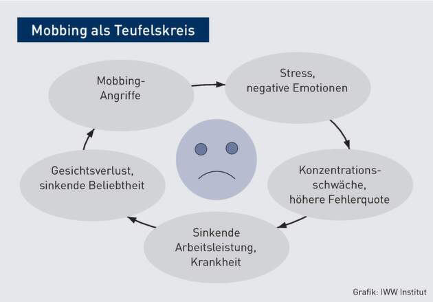 Mobbing verursacht Stress und andere negative Emotionen. Es schädigt dadurch die seelische und körperliche Gesundheit der Opfer. Die Arbeitsleistung sinkt und die Betroffenen werden dadurch noch mehr zur Zielscheibe von Mobbingangriffen, sodass die Opferrolle sich festigt und ein Teufelskreis entsteht.