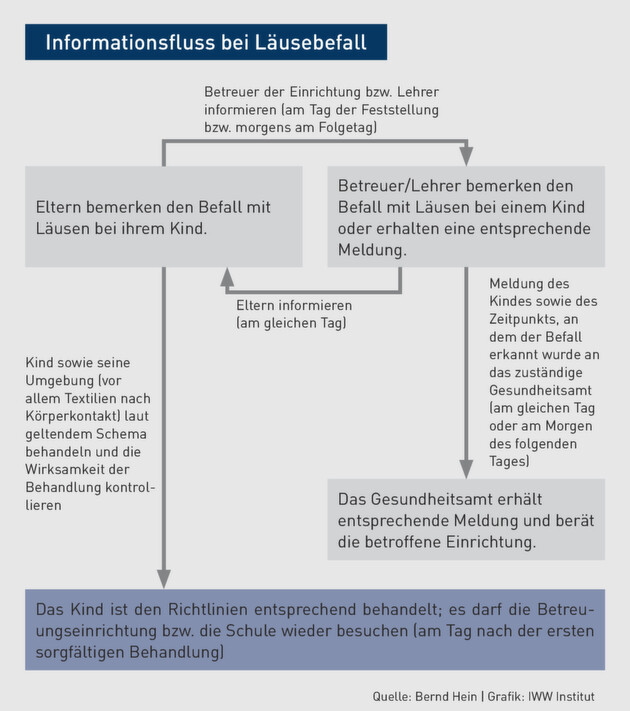Eltern sollten nach dem Bemerken des Läusebefalls unverzüglich die jeweiligen Gemeinschaftseinrichtungen benachrichtigen, die das Kind besucht (siehe Grafik). Daraus entstehen keine persönlichen Nachteile, sondern die Information hilft vielmehr, alle ggf. Betroffenen rasch zu behandeln.