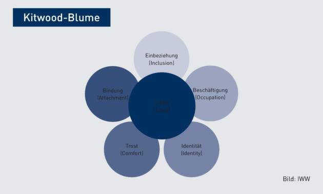 Kitwoods Konzept hat zum Ziel, das Wohlbefinden dementer Menschen so weit wie möglich zu fördern. Dies geschieht durch die Berücksichtigung ihrer grundlegenden Bedürfnisse, zu denen vor allem Liebe, Trost, Bindung, Einbezogensein, Beschäftigung und Identität gehören. Diese emotionalen Bedürfnisse lassen sich in Form einer Blüte darstellen.
