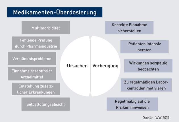Die Ursachen für Überdosierung sind oft bereits im System der Pharmazie in Deutschland angelegt. Die Pharmaindustrie überprüft nur in Ausnahmefällen durch Studien die Wirkung ihrer Substanzen auf alte Menschen. Das verursacht erhebliche Risiken, da im Zuge der Alterung unter anderem die Leistungsfähigkeit der Leber sinkt und die Zielgewebe der Wirkstoffe ihre Empfindlichkeit ändern. Deshalb bleibt der Anteil des Arzneimittels im Blut für längere Zeit höher, als dies bei jüngeren Menschen der Fall ist. Darüber hinaus kommen folgende weitere Ursachen für Überdosierungen in Betracht, an die Sie als MFA denken sollten, wenn Sie mit Ihren Patienten über Krankheitsverläufe bzw. Medikamenteneinnahme sprechen oder ihnen Rezepte aushändigen:
