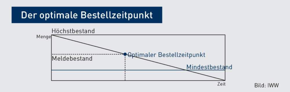 Der Meldebestand ist die Bestandsgröße, bei welcher nachbestellt werden muss. Dadurch wird sichergestellt, dass nicht auf den Mindestbestand zurückgegriffen wird.