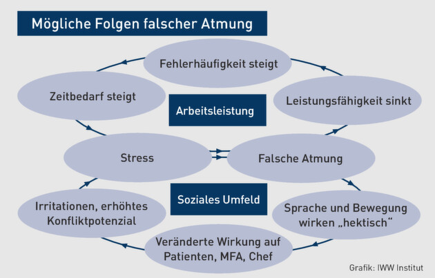 Bei Stress wird die Atmung unbewusst flach, gepresst und kurz. In welche Teufelskreise Sie das als MFA im Praxisalltag führen kann, zeigt die folgende Grafik.