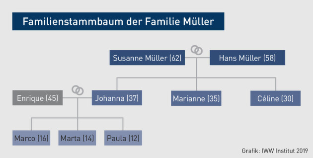 Hans (58) ist glücklich verheiratet und hat drei erwachsene Kinder. Seine Frau Susanne (62) hilft im Unternehmen in Teilzeit mit und führt u. a. die Kreditorenbuchhaltung. Und so sieht der Stammbaum der Unternehmerfamilie aus: