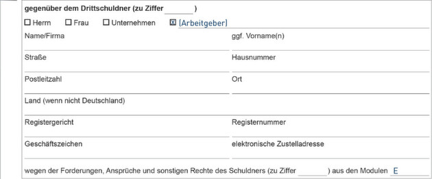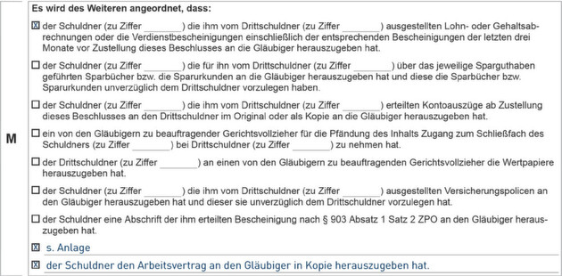 - Vertragsprüfung und Lohnzusammensetzung: Prüfen Sie, ob und in welcher Form ein Teil der Vergütung als Kryptowert (z. B. Ether) im Arbeitsvertrag vereinbart wurde und welche Umrechnungsmechanismen festgelegt sind. Verlangen Sie hierzu über das Modul M vom Schuldner den Arbeitsvertrag und die monatliche Lohnabrechnung heraus (§ 836 Abs. 3 ZPO).