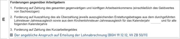 - Die Lohnabrechnung können Sie auch vom Drittschuldner herausverlangen, was effektiver sein dürfte (vgl. BGH VE 13, 59)! Ermitteln Sie anschließend (Modul E), welche Beträge als Barlohn (Euro) und welche als Krypto-Sachbezug gezahlt werden.